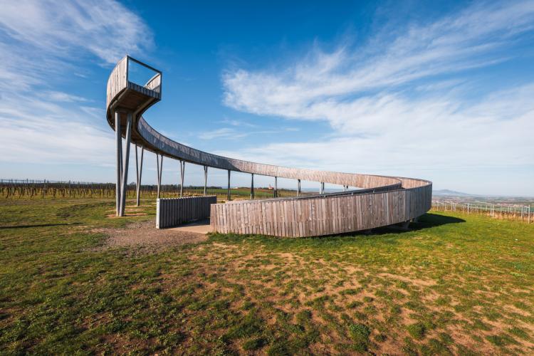 Zu einem leichten nachmittäglichen Spaziergang bietet sich der Weg von Vrbice zum Aussichtspunkt Stezka nad vinohrady auf dem Kobylí vrch an, der durchaus zur architektonischen Thematik dieses Ausflugs passt. Kein hoher Turm, der sich dem Himmel entgegen reckt, sondern eine Form, die sich harmonisch aus der umgebenden Landschaft erhebt. Aus der Vogelperspektive würde Ihnen das Bauwerk wie ein Schneckenhaus erscheinen. Die Form des unvollständigen Kreises verweist auf die Höhe des Gipfels, auf dem sich der Aussichtspunkt befindet. Er beschreibt eine Kreislinie von 334° und bietet Ausblicke in alle Richtungen.