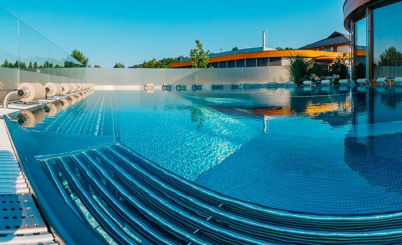 Der Wasserpark mit mehreren Schwimmbädern, einer Wasserrutsche und einem Fitnessraum verfügt über perfekte Einrichtungen für ruhige Entspannung – zum Beispiel Regenerationsbehandlungen und eine Sonnenterrasse.